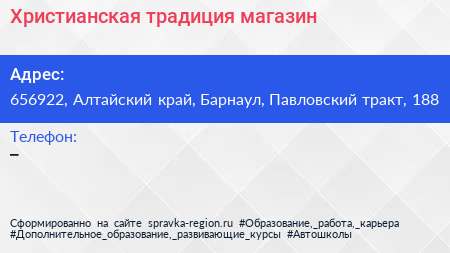 Христианская традиция, магазин по адресу 656922, Алтайский край, Барнаул, Павловский тракт, 188 в дальнейшем Организация, размещена в следующих категориях: