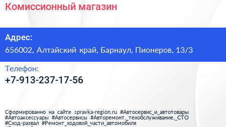 Комиссионный магазин по адресу 656002, Алтайский край, Барнаул, Пионеров, 13/3 в дальнейшем Организация, размещена в следующих категориях:
