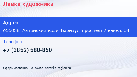 Лавка художника по адресу 656038, Алтайский край, Барнаул, проспект Ленина, 54 в дальнейшем Организация, размещена в следующих категориях:
