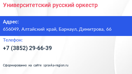 Университетский русский оркестр по адресу 656049, Алтайский край, Барнаул, Димитрова, 66 в дальнейшем Организация, размещена в следующих категориях: