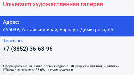 Universum, художественная галерея по адресу 656049, Алтайский край, Барнаул, Димитрова, 66 в дальнейшем Организация, размещена в следующих категориях: