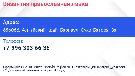 Византия, православная лавка по адресу 656066, Алтайский край, Барнаул, Сухэ-Батора, 3а в дальнейшем Организация, размещена в следующих категориях: