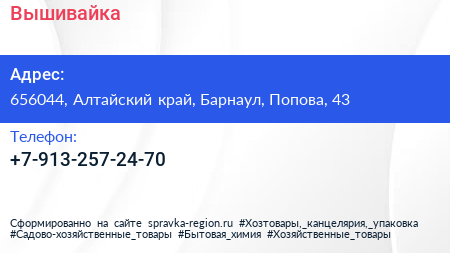 Вышивайка по адресу 656044, Алтайский край, Барнаул, Попова, 43 в дальнейшем Организация, размещена в следующих категориях: