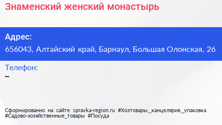 Знаменский женский монастырь по адресу 656043, Алтайский край, Барнаул, Большая Олонская, 26 в дальнейшем Организация, размещена в следующих категориях: