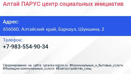 Алтай-ПАРУС, центр социальных инициатив по адресу 656060, Алтайский край, Барнаул, Шукшина, 2 в дальнейшем Организация, размещена в следующих категориях: