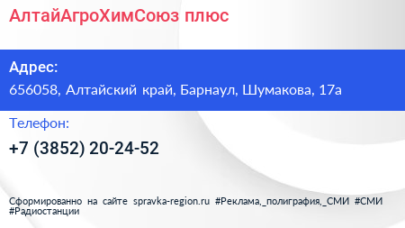 АлтайАгроХимСоюз плюс по адресу 656058, Алтайский край, Барнаул, Шумакова, 17а в дальнейшем Организация, размещена в следующих категориях: