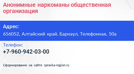 Анонимные наркоманы, общественная организация по адресу 656052, Алтайский край, Барнаул, Телефонная, 50а в дальнейшем Организация, размещена в следующих категориях: