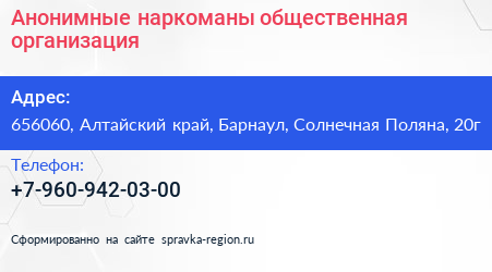 Анонимные наркоманы, общественная организация по адресу 656060, Алтайский край, Барнаул, Солнечная Поляна, 20г в дальнейшем Организация, размещена в следующих категориях: