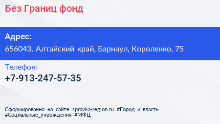 Без Границ, фонд по адресу 656043, Алтайский край, Барнаул, Короленко, 75 в дальнейшем Организация, размещена в следующих категориях: