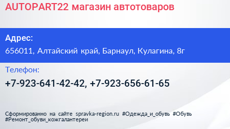 AUTOPART22, магазин автотоваров по адресу 656011, Алтайский край, Барнаул, Кулагина, 8г в дальнейшем Организация, размещена в следующих категориях: