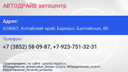 АВТОДРАЙВ, автоцентр по адресу 656067, Алтайский край, Барнаул, Балтийская, 80 в дальнейшем Организация, размещена в следующих категориях: