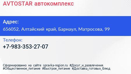 AVTOSTAR, автокомплекс по адресу 656052, Алтайский край, Барнаул, Матросова, 99 в дальнейшем Организация, размещена в следующих категориях: