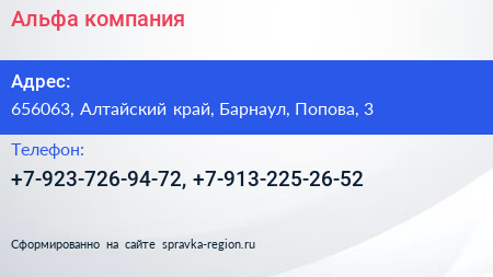 Альфа, компания по адресу 656063, Алтайский край, Барнаул, Попова, 3 в дальнейшем Организация, размещена в следующих категориях:
