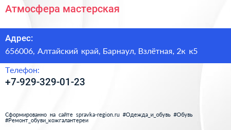 Атмосфера, мастерская по адресу 656006, Алтайский край, Барнаул, Взлётная, 2к к5 в дальнейшем Организация, размещена в следующих категориях: