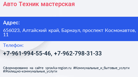 Авто-Техник, мастерская по адресу 656023, Алтайский край, Барнаул, проспект Космонавтов, 11 в дальнейшем Организация, размещена в следующих категориях: