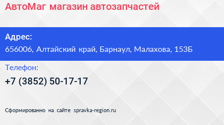 АвтоМаг, магазин автозапчастей по адресу 656006, Алтайский край, Барнаул, Малахова, 153Б в дальнейшем Организация, размещена в следующих категориях:
