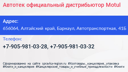Автотек, официальный дистрибьютор Motul по адресу 656064, Алтайский край, Барнаул, Автотранспортная, 41Б в дальнейшем Организация, размещена в следующих категориях:
