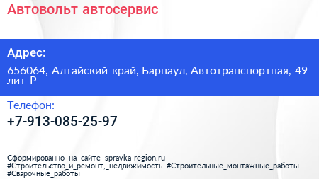 Автовольт, автосервис по адресу 656064, Алтайский край, Барнаул, Автотранспортная, 49 лит Р в дальнейшем Организация, размещена в следующих категориях: