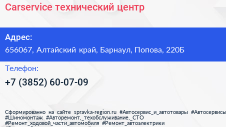 Carservice, технический центр по адресу 656067, Алтайский край, Барнаул, Попова, 220Б в дальнейшем Организация, размещена в следующих категориях: