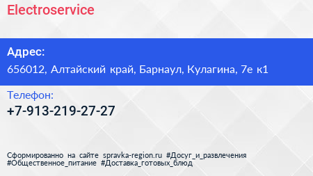 Electroservice по адресу 656012, Алтайский край, Барнаул, Кулагина, 7е к1 в дальнейшем Организация, размещена в следующих категориях: