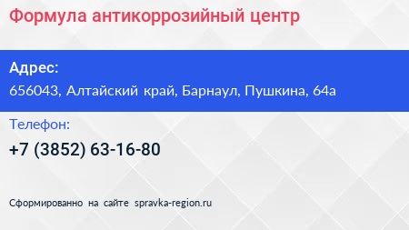 Формула, антикоррозийный центр по адресу 656043, Алтайский край, Барнаул, Пушкина, 64а в дальнейшем Организация, размещена в следующих категориях: