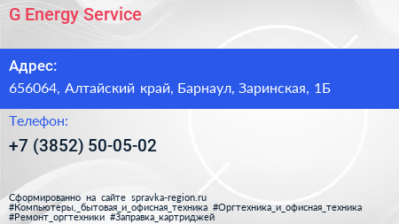 G-Energy Service по адресу 656064, Алтайский край, Барнаул, Заринская, 1Б в дальнейшем Организация, размещена в следующих категориях: