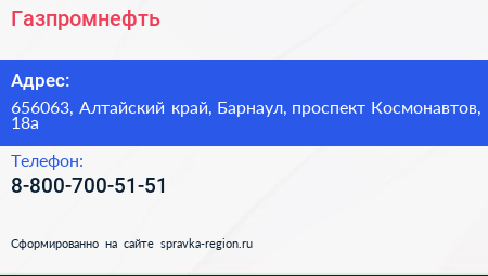 Газпромнефть по адресу 656063, Алтайский край, Барнаул, проспект Космонавтов, 18а в дальнейшем Организация, размещена в следующих категориях: