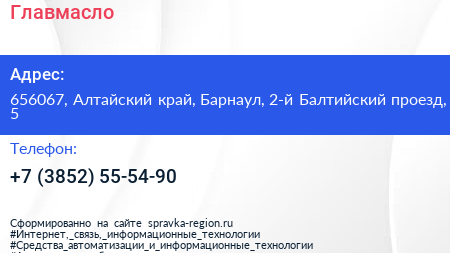 Главмасло по адресу 656067, Алтайский край, Барнаул, 2-й Балтийский проезд, 5 в дальнейшем Организация, размещена в следующих категориях:
