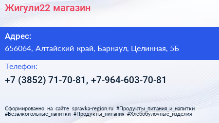 Жигули22, магазин по адресу 656064, Алтайский край, Барнаул, Целинная, 5Б в дальнейшем Организация, размещена в следующих категориях: