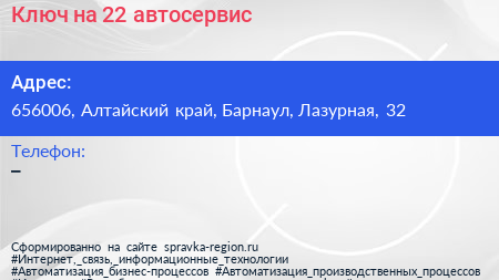 Ключ на 22, автосервис по адресу 656006, Алтайский край, Барнаул, Лазурная, 32 в дальнейшем Организация, размещена в следующих категориях: