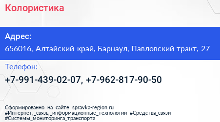 Колористика по адресу 656016, Алтайский край, Барнаул, Павловский тракт, 27 в дальнейшем Организация, размещена в следующих категориях: