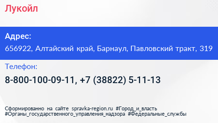 Лукойл по адресу 656922, Алтайский край, Барнаул, Павловский тракт, 319 в дальнейшем Организация, размещена в следующих категориях: