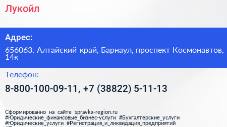 Лукойл по адресу 656063, Алтайский край, Барнаул, проспект Космонавтов, 14к в дальнейшем Организация, размещена в следующих категориях: