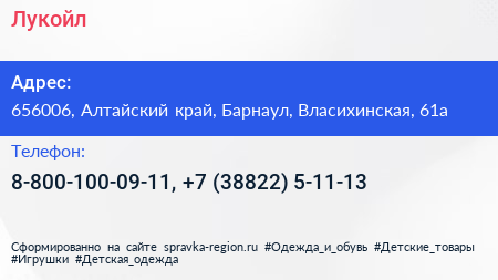 Лукойл по адресу 656006, Алтайский край, Барнаул, Власихинская, 61а в дальнейшем Организация, размещена в следующих категориях: