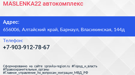 #MASLENKA22, автокомплекс по адресу 656006, Алтайский край, Барнаул, Власихинская, 144д в дальнейшем Организация, размещена в следующих категориях: