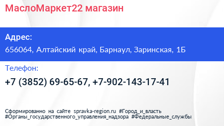 МаслоМаркет22, магазин по адресу 656064, Алтайский край, Барнаул, Заринская, 1Б в дальнейшем Организация, размещена в следующих категориях: