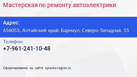 Мастерская по ремонту автоэлектрики по адресу 656053, Алтайский край, Барнаул, Северо-Западная, 55 в дальнейшем Организация, размещена в следующих категориях: