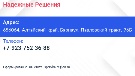 Надежные Решения по адресу 656064, Алтайский край, Барнаул, Павловский тракт, 76Б в дальнейшем Организация, размещена в следующих категориях: