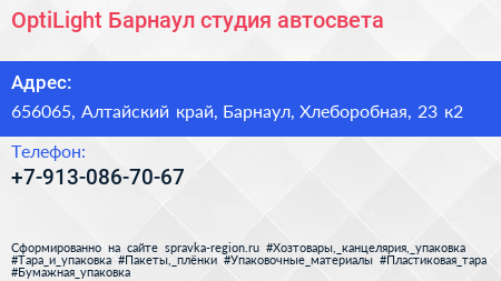 OptiLight Барнаул, студия автосвета по адресу 656065, Алтайский край, Барнаул, Хлеборобная, 23 к2 в дальнейшем Организация, размещена в следующих категориях: