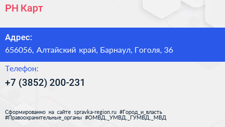 РН-Карт по адресу 656056, Алтайский край, Барнаул, Гоголя, 36 в дальнейшем Организация, размещена в следующих категориях: