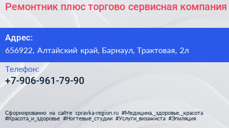 Ремонтник плюс, торгово-сервисная компания по адресу 656922, Алтайский край, Барнаул, Трактовая, 2л в дальнейшем Организация, размещена в следующих категориях: