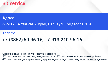 SD service по адресу 656006, Алтайский край, Барнаул, Гридасова, 15а в дальнейшем Организация, размещена в следующих категориях: