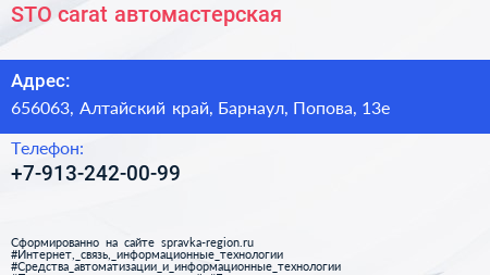 STO-carat, автомастерская по адресу 656063, Алтайский край, Барнаул, Попова, 13е в дальнейшем Организация, размещена в следующих категориях: