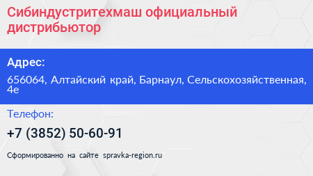 Сибиндустритехмаш, официальный дистрибьютор по адресу 656064, Алтайский край, Барнаул, Сельскохозяйственная, 4е в дальнейшем Организация, размещена в следующих категориях: