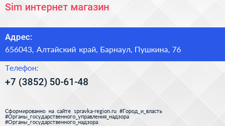 Sim, интернет-магазин по адресу 656043, Алтайский край, Барнаул, Пушкина, 76 в дальнейшем Организация, размещена в следующих категориях: