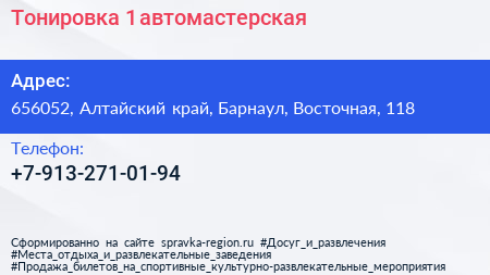 Тонировка №1, автомастерская по адресу 656052, Алтайский край, Барнаул, Восточная, 118 в дальнейшем Организация, размещена в следующих категориях: