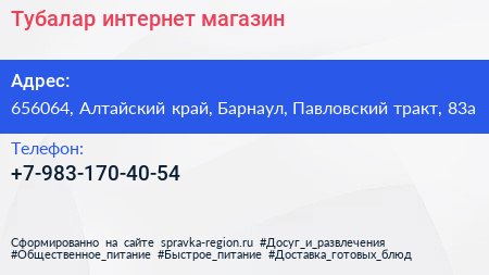 Тубалар, интернет-магазин по адресу 656064, Алтайский край, Барнаул, Павловский тракт, 83а в дальнейшем Организация, размещена в следующих категориях: