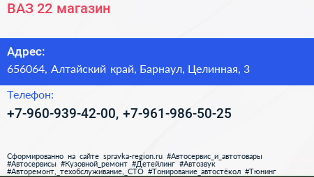 ВАЗ 22, магазин по адресу 656064, Алтайский край, Барнаул, Целинная, 3 в дальнейшем Организация, размещена в следующих категориях: