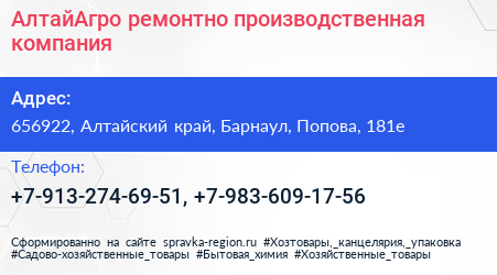 АлтайАгро, ремонтно-производственная компания по адресу 656922, Алтайский край, Барнаул, Попова, 181е в дальнейшем Организация, размещена в следующих категориях:
