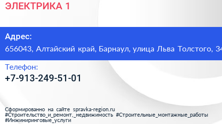 ЭЛЕКТРИКА №1 по адресу 656043, Алтайский край, Барнаул, улица Льва Толстого, 34 в дальнейшем Организация, размещена в следующих категориях: